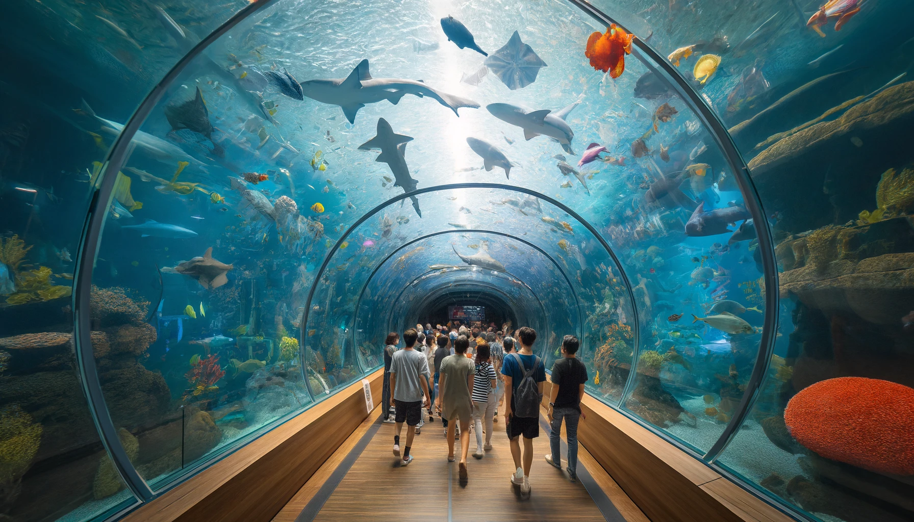 80m 길이의 수중 터널을 거닐며 바다 밑바닥을 걷는 듯한 기분을 느껴보세요. 이 몰입형 경험은 주변에서 수영하는 해양 생물을 360도 뷰로 제공합니다. - 오션 아레나 쇼