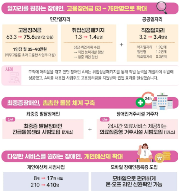 - 장애인 고용 장려금을 확대하여 75만 6천 명 이상의 고용 기회를 창출합니다. - 중증 장애인 맞춤형 케어: 개인화된 복지 체계를 통해 복지 사각지대를 줄이고 안정적인 지원을 제공합니다.