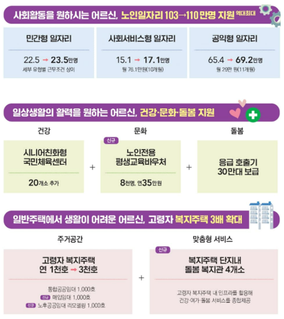 • 고령자와 장애인 지원: - 노인을 위한 110만 개의 일자리를 제공하며,
