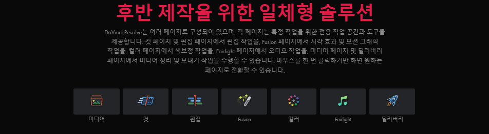 다빈치 리졸브는 편집, 색보정, 시각효과, 모션 그래픽, 오디오 후반 제작 기능이 모두 포함된 세계 유일의 일체형 소프트웨어입니다. 고급스럽고 세련된 인터페이스는 초보자들도 쉽게 사용법을 익힐 수 있으며, 전문가가 필요로 하는 기능 또한 지원합니다.